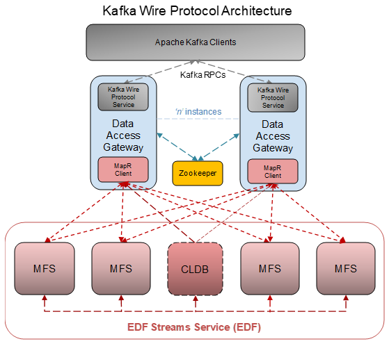 The Apache Kafka Wire Protocol Service works within DAG (data access gateway) to act as a Kafka Broker (server in an Apache Kafka cluster). For all application purposes, the HPE Data Fabric cluster (with DAG and Apache Kafka Wire Protocol Service) runs like an Apache Kafka cluster.